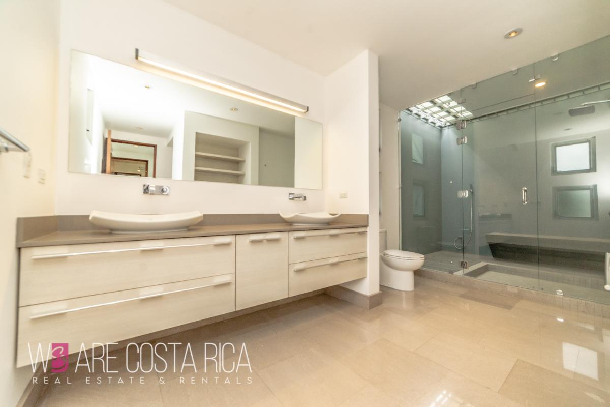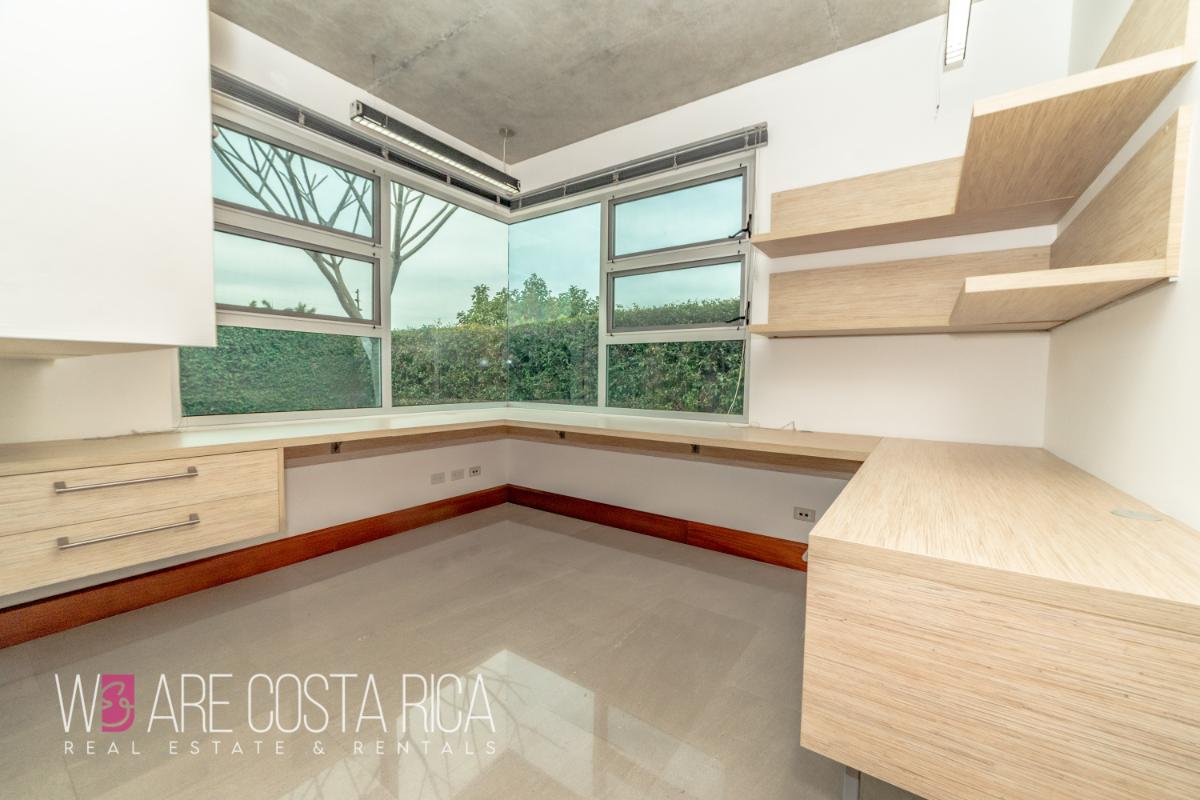 ID# 116678. Modern house for sale in Lindora, Santa Ana, Nya condominium, 354 sqm construction, 850 sqm land, 3 bedrooms, 3 baths, US$850.000. This single-story house is a perfect example of minimalist luxury living. It is situated in a sought-after condominium in Lindora, surrounded by lush greenery and plenty of natural light. The house features three bedrooms, each with its own private bathroom. An office space is also available, perfect for those who need a place to work from home. The semi-integrated kitchen is conveniently located next to the TV room or dining room, allowing for seamless entertaining. There is also a service room with its own bathroom. At the heart of the house lies a central patio, providing the perfect opportunity to create a beautiful pool or garden. The patio is surrounded by a covered terrace, which is fully integrated into the main room. The house is also conveniently located close to the common areas of the condominium, making it easy to access amenities like the pool, gym, and play areas. This house presents beautiful natural surroundings, plenty of natural light, and close proximity to the common areas, this house is a fantastic choice for anyone looking for a high-end home. This is a modern house that has been tastefully designed with luxurious details. It features Hansfroge brand faucets and bathroom accessories throughout, as well as Nouvell bathroom furniture, and all doors, skirting boards, and guest bathroom countertops made from cedar wood. The floors throughout the house are marble, and the perimeter fence is lit up for added security. The condominium offers 24/7 security and amenities such as pool, playground, lounge with BBQ, green areas and club house. Excelente location, close to commerce, gastronomy, banking, medical services, among other in the area of Santa Ana.