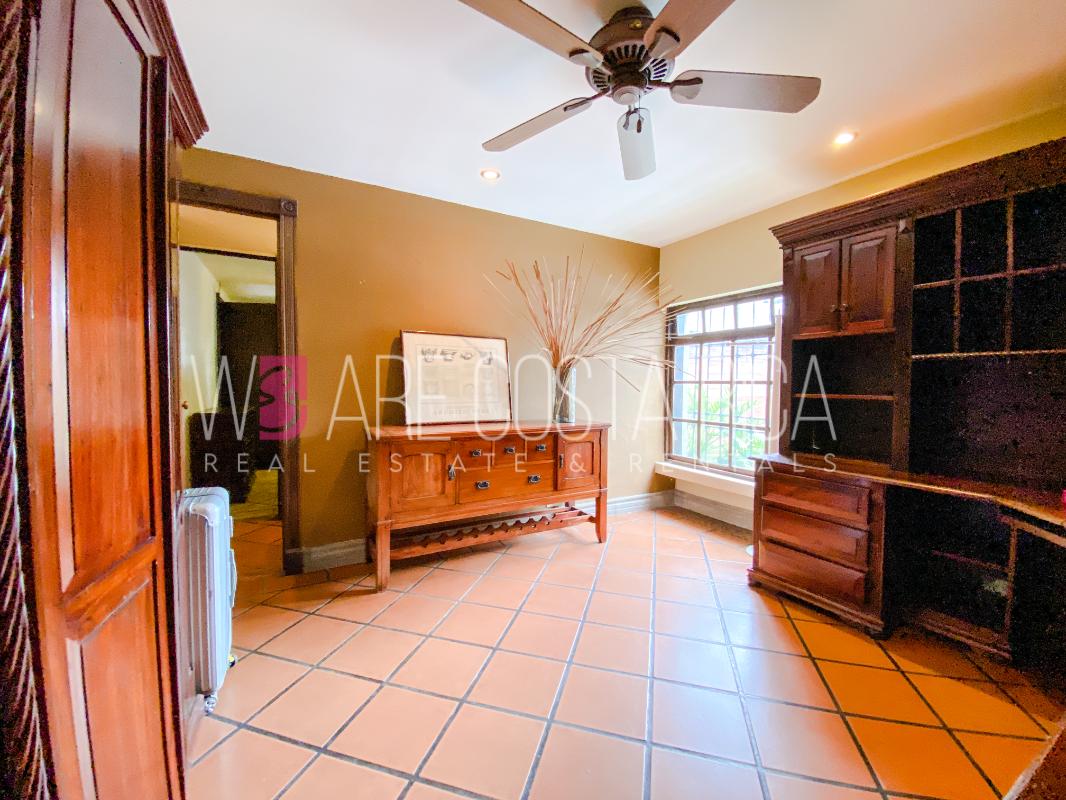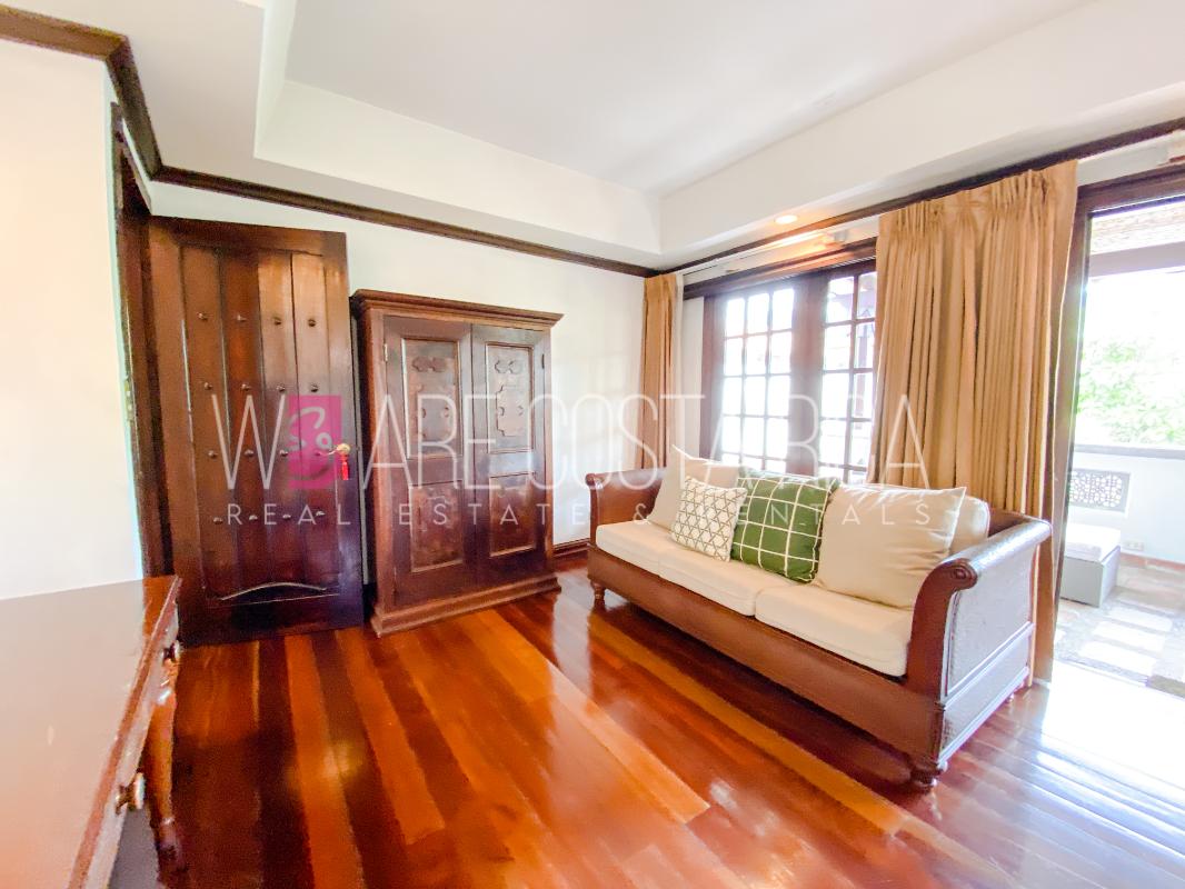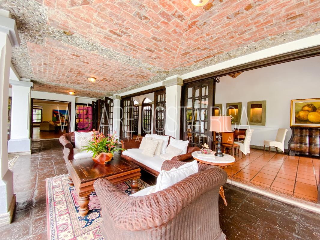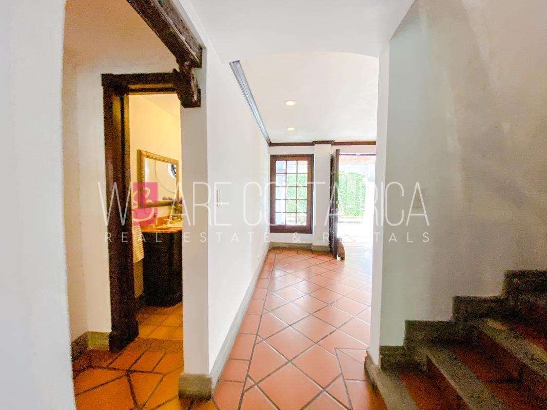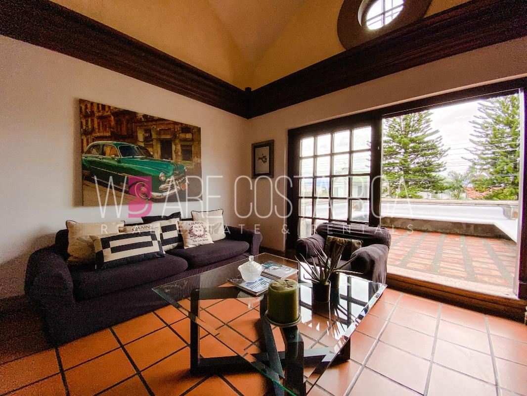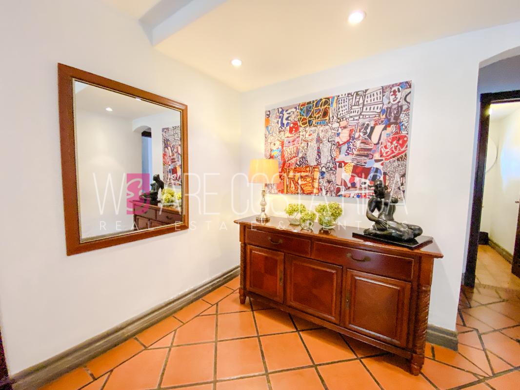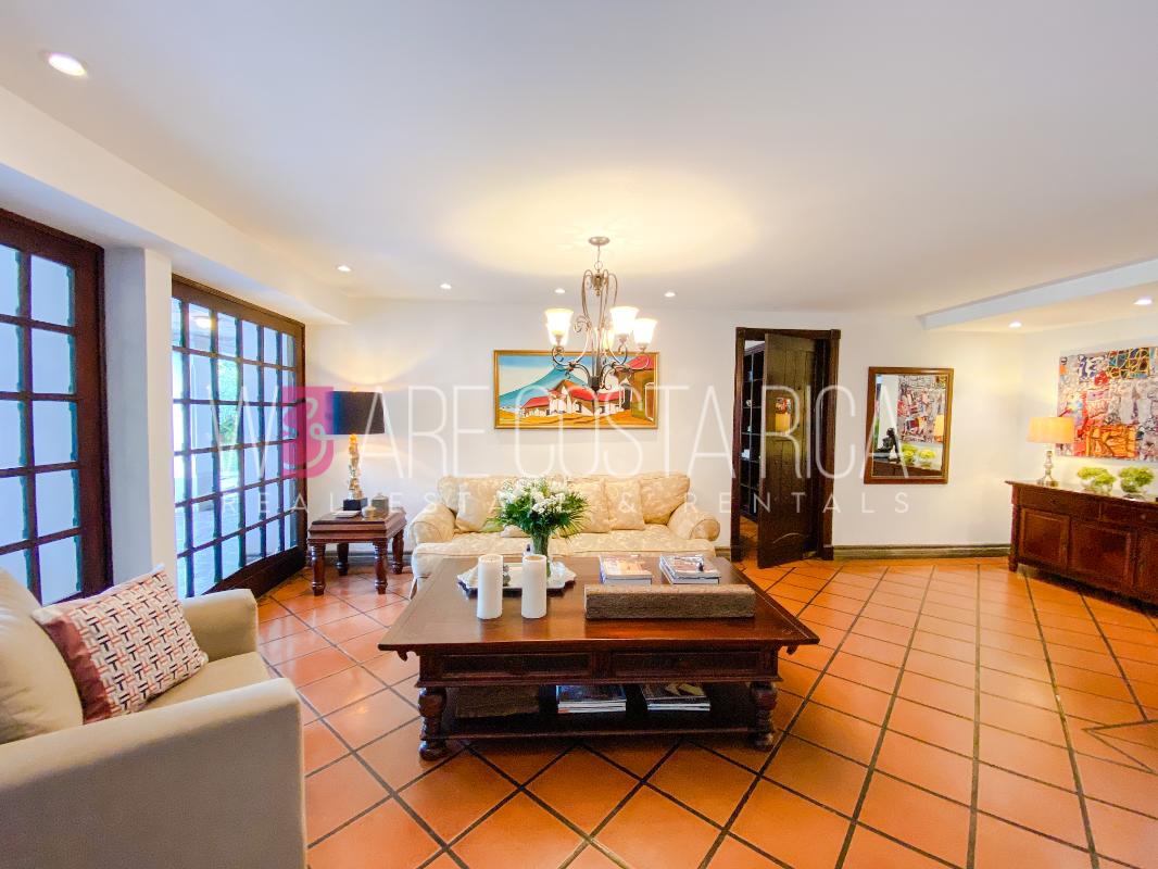 ID# 115795. Venta de casa estilo colonial en Los Laureles, Escazú, 820 m2 de construcción, 1.052 m2 de terreno, 5 habitaciones, 5.5 baños, US$850.000 (Financiamiento disponible por parte del propietario). Hermosa casa tradicional de 2 pisos con un encanto único. Cuenta con una elegante arquitectura colonial que incluye columnas decorativas, puertas y ventanas francesas de madera, amplias terrazas y cielos altos abovedados de ladrillo. Cuenta con amplios espacios con mucha luz natural y ventilación, tanto en áreas sociales como privadas. Sala de estar y comedor formal que se conectan a las terrazas y al jardín. Cocina de lujo, separada, con sobres de granito, mucho espacio de almacenaje, desayunador y electrodomésticos de alta gama. Hay 2 salas de TV, área de lavado, cuarto de servicio con baño, 2 oficinas y garaje para 5 vehículos. El área privada cuenta con 5 amplios dormitorios con finos pisos de madera. Todos tienen su propio baño y closets, pero el principal tiene walk-in closet. La propiedad tiene una excelente ubicación dentro del barrio residencial Los Laureles. Es una zona segura y tranquila en el muy buscado distrito de San Rafael en Escazú. Cerca de una amplia variedad de amenidades y servicios urbanos.