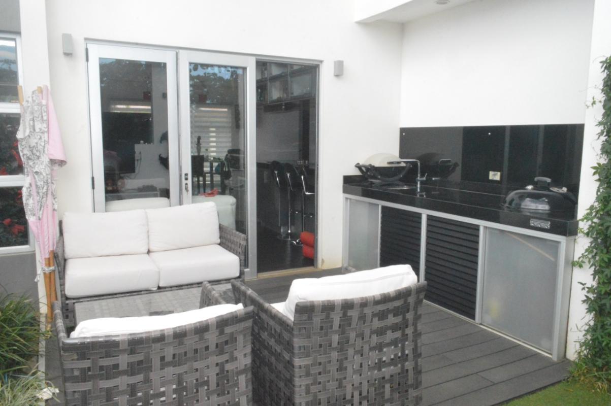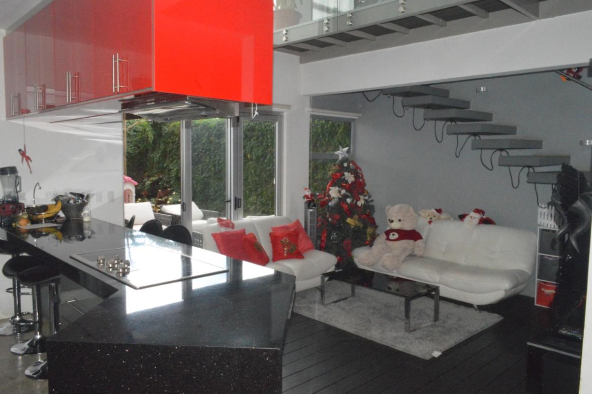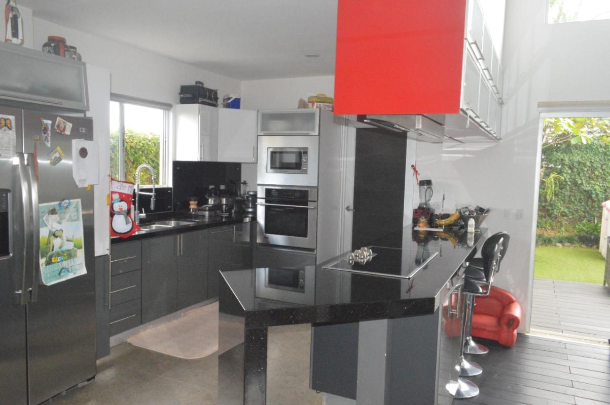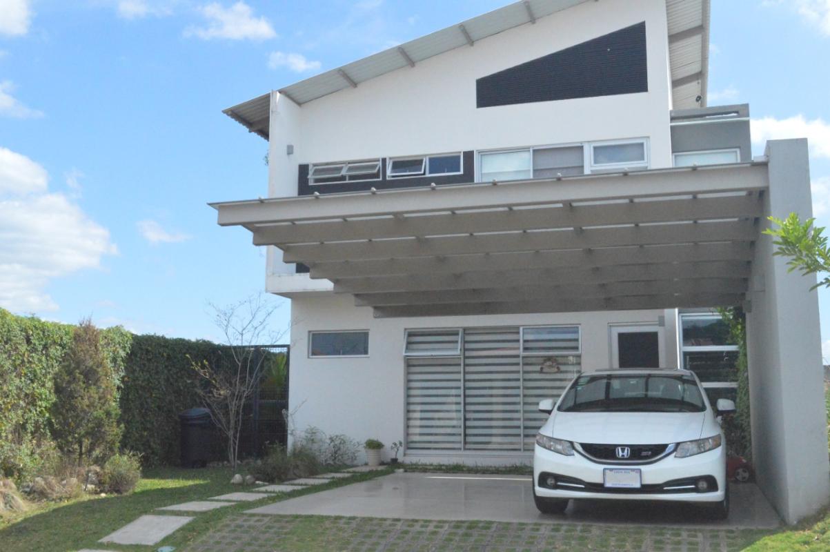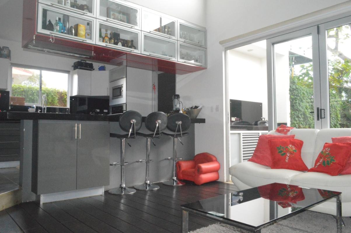 ID# 115834. Contemporary house for sale in Grecia, Montezuma condominium, 174 sqm construction, 230 sqm land, 2 bedrooms, 2.5 baths, US$174.000. Two-story house with modern design, fine finishes and nice outdoors entertaining space. The first floor features a double-height living and dining room that open towards a terrace with kitchenette area. Then next is the backyard. Integrated kitchen, fully equipped and with breakfast nook (granite countertops). The first level also has laundry room with washer and dryer, and a roofed garage for 2 vehicles. The second floor features 2 bedrooms, and 2 baths. The master bedroom has walk-in closet, balcony and en-suite bath. The secondary bedroom has closet and a large separated bath. The condominium offers 24/7 security with CCTV monitoring, controlled access, electrified fence. Amenities: 8 BBQ ranchos, 3 pools, jacuzzi, gym, soccer field, tennis/squash/volleyball courts, walking trails, playground, pet park and parking for visitors.