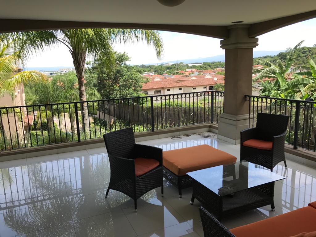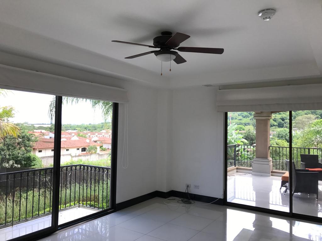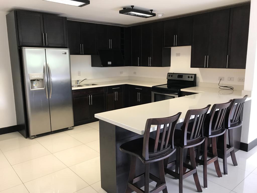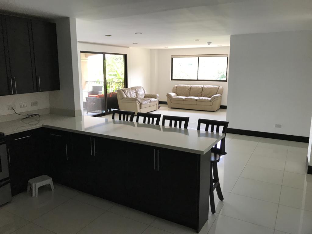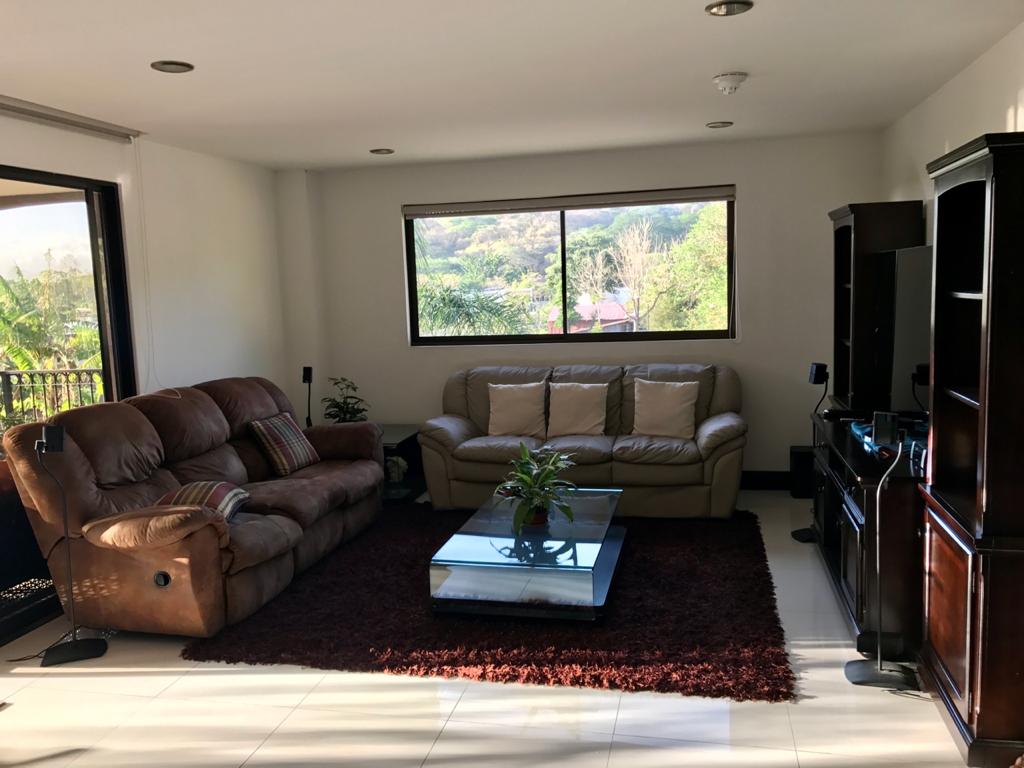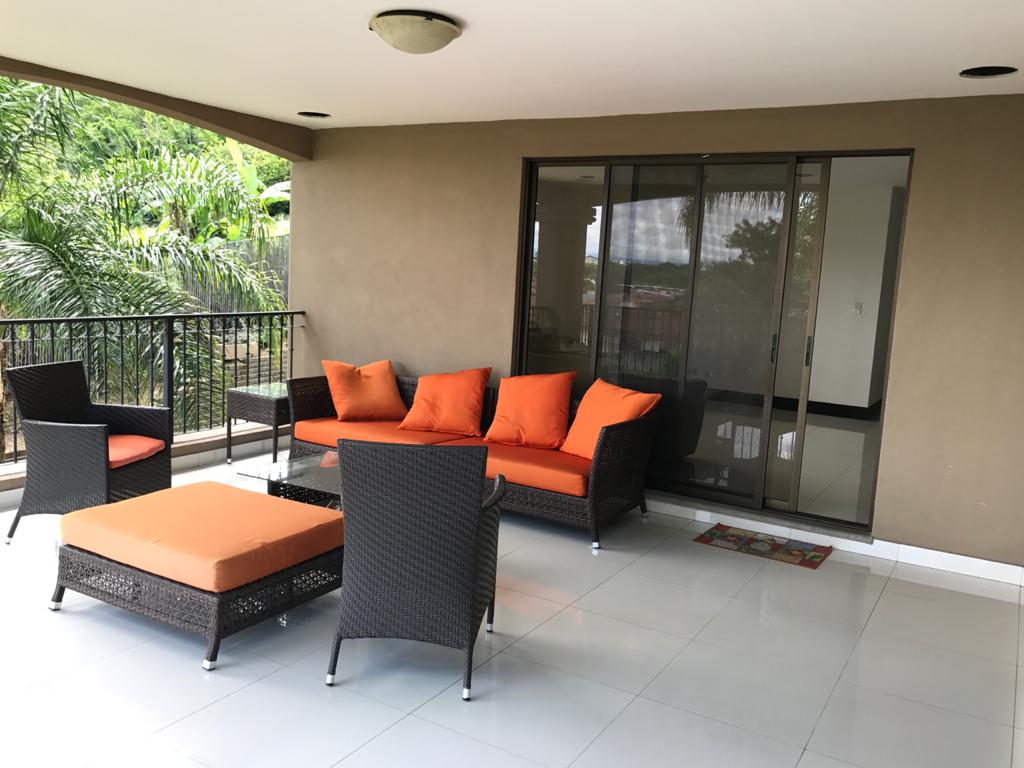 ID# 115900. Contemporary apartment for sale or rent in Santa Ana, Vía Nova condominium, 196 sqmt construction, 3 bedrooms, 2 baths, US$349.000 or US$2.000/mo + IVA (includes maintenance fee). This is a corner apartment with nice terrace with panoramic views. Modern design with open concept design and good natural light. Integrated kitchen with breakfast nook, semi-equipped with stove and conventional oven. There is an office or TV room, ample terrace, service room with bath and laundry area with washer and dryer. The bedrooms are ample and they have ceiling fans. The master bedroom has private bath and walk-in closet; the secondary bedrooms share a full bath. Roofed garage for 2 vehicles. The property includes: Roman curtains, blackout curtains, 4 A/C units, and terrace furniture. Excellent condominium with 24/7 security and a great environment for families. Amenities: pool, BBQ rancho, playground, tennis court, parking for visitors. Easy access to supermarkets, renowned shopping centers, fine restaurants, popular entertainment venues, private schools, financial entities and highway 27.