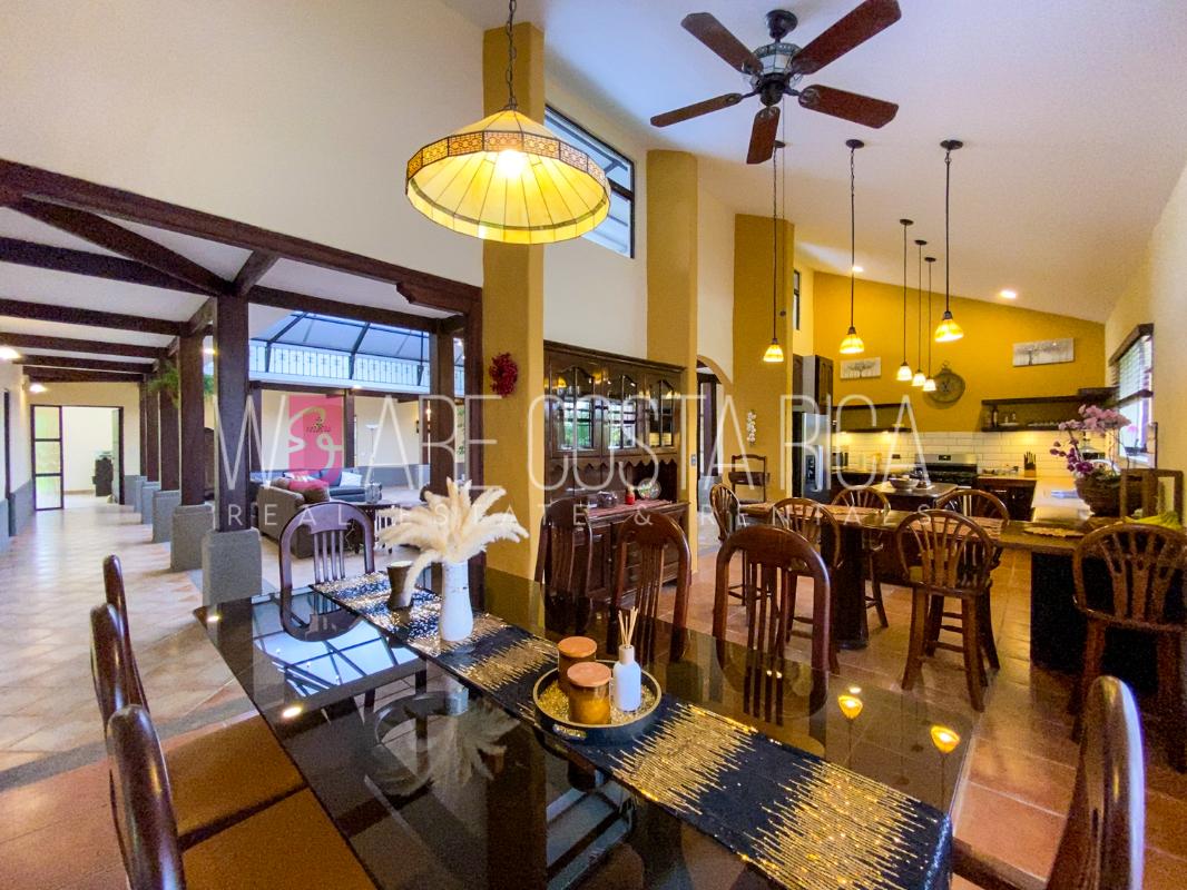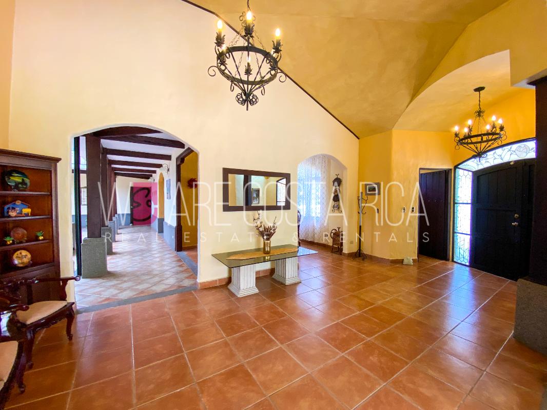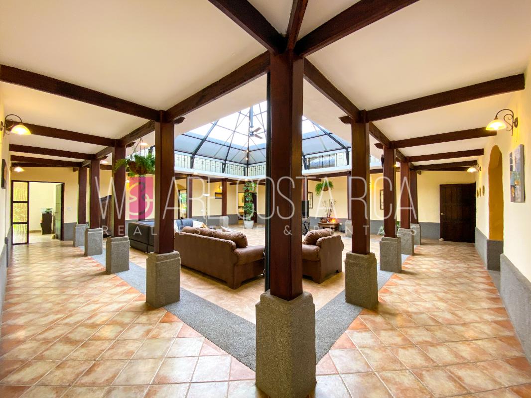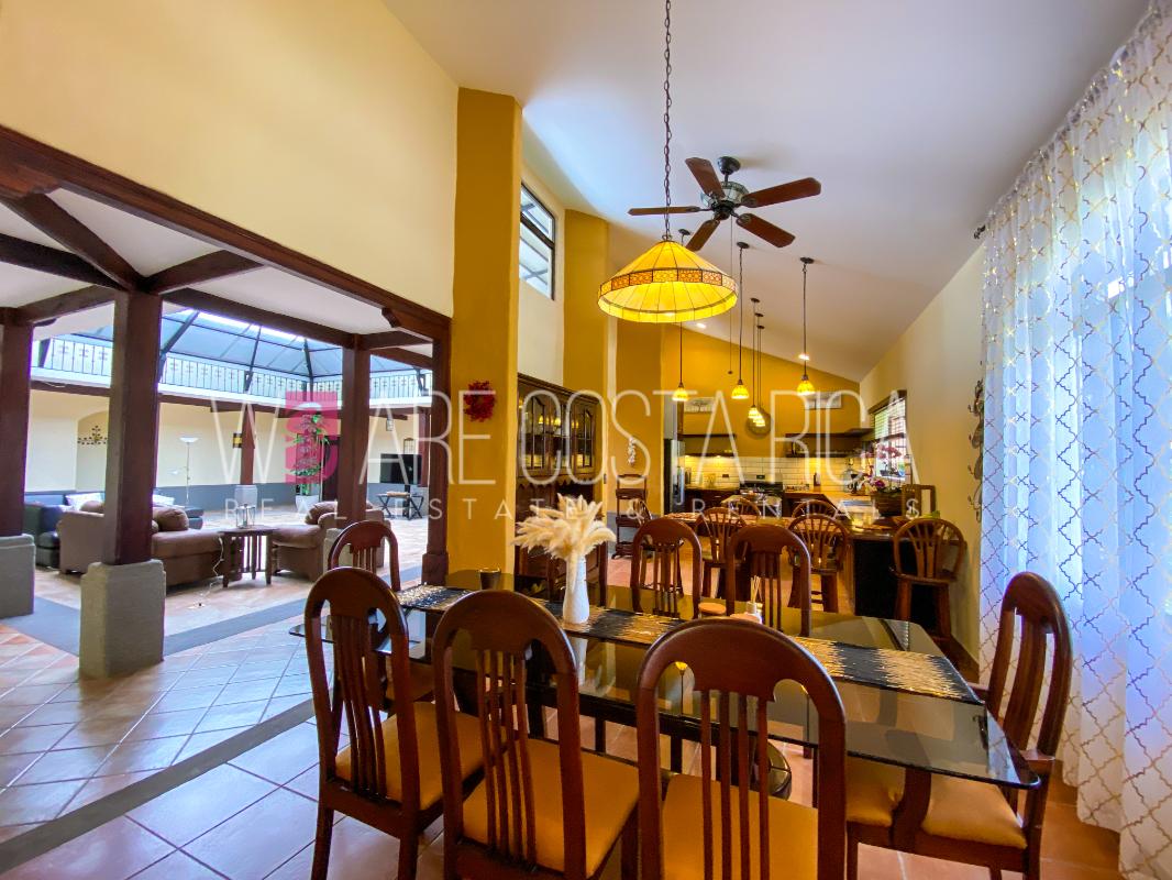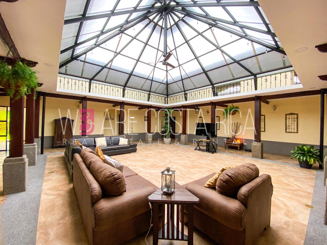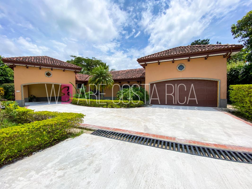 ID# 115914. Beautiful house for sale or rent in La Guácima, Hacienda Los Reyes, 623 sqmt construction, 1.153 sqmt land, 7 bedrooms, 3.5 baths, US$490.000 or US$3.000/mo (negotiable). Beautiful house that has a ranch-style architecture with ample spaces, fresh, wooden customized details, all in one level and it’s totally furnished! It has a large internal center terrace, fully covered by a huge vaulted skylight which provides maximum natural light to the entire house. The different spaces are distributed around this terrace, all of them with high ceilings. The kitchen, dinette and formal dining share one area; the living room and other terraces are in a separate area, as well as the bedrooms. There is an office that could be used as extra bedroom. The master bedroom has bath with jacuzzi. A beautiful landscaped garden surrounds the property. It also has full service room, bodega and closed garage for 2 vehicles. This property is located in Hacienda Los Reyes, an exclusive residential complex that offers 24/7 security and great amenities like its a golf course, club house, tennis courts, gym, and swimming pools. It is strategically located close to a variety of urban facilities, the international airport and private schools.