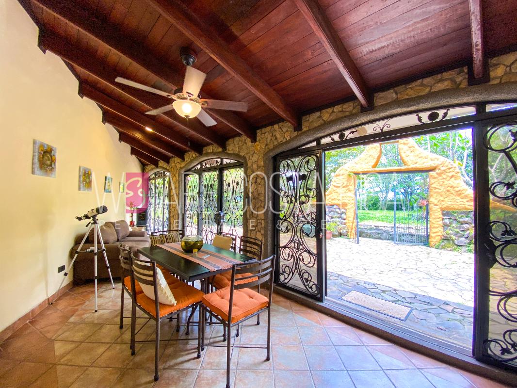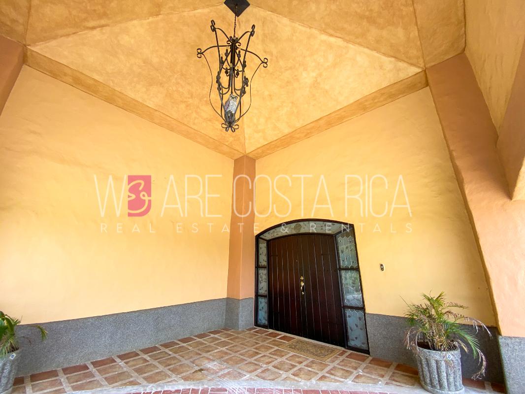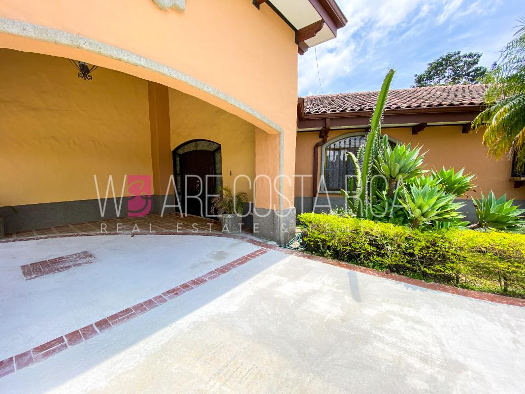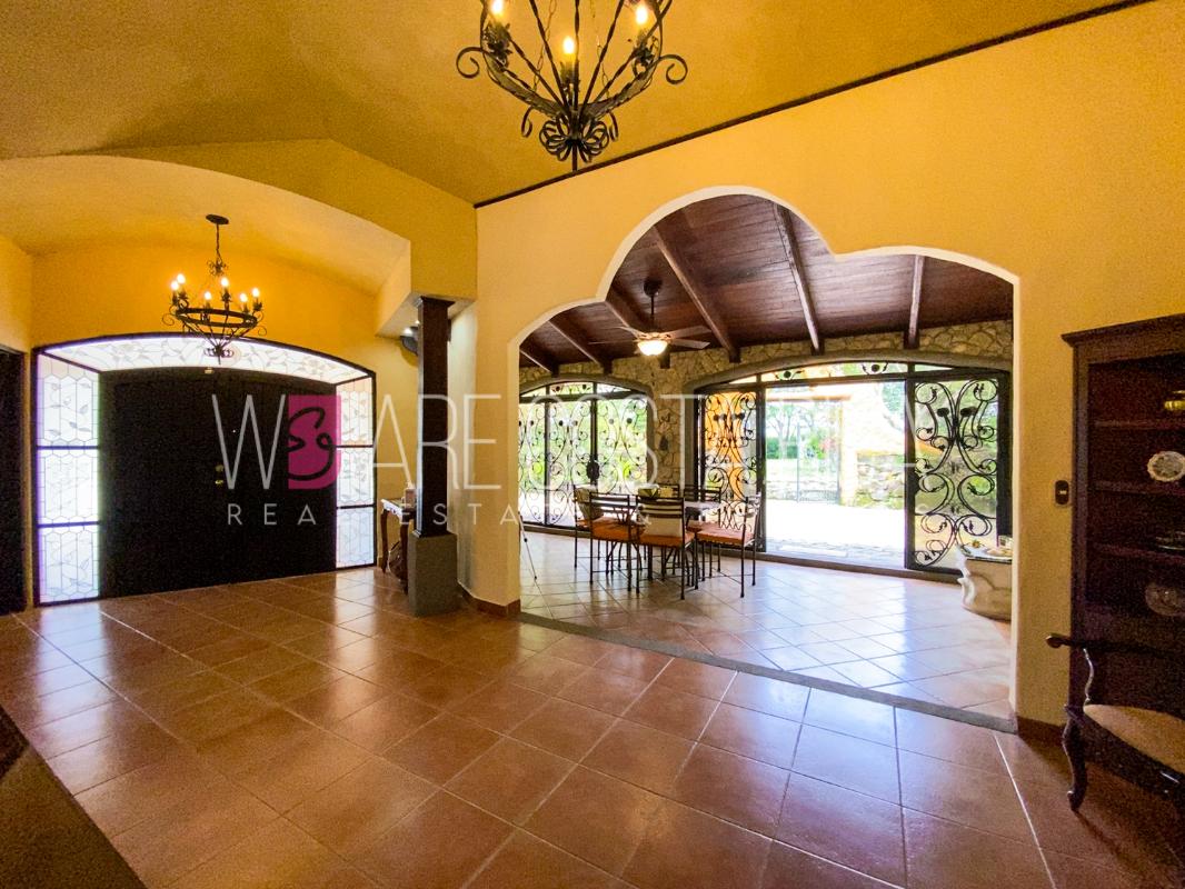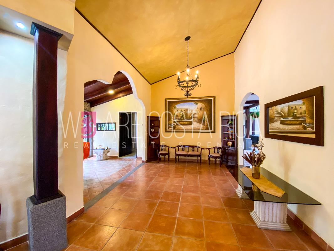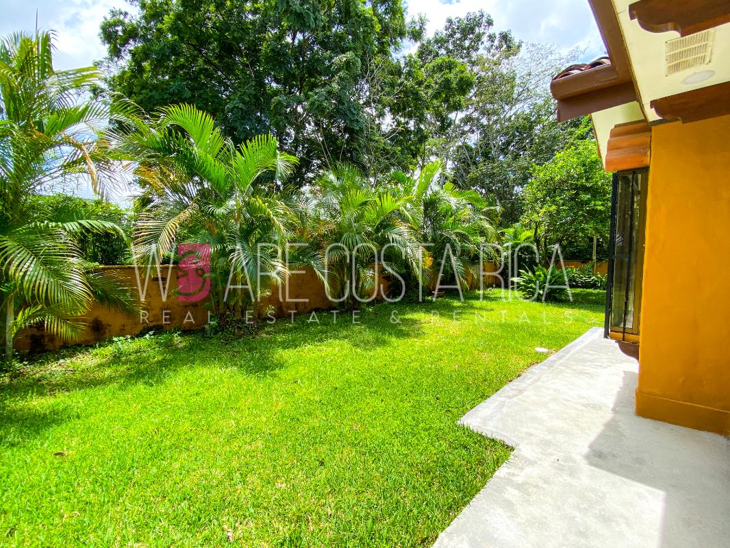ID# 115914. Beautiful house for sale or rent in La Guácima, Hacienda Los Reyes, 623 sqmt construction, 1.153 sqmt land, 7 bedrooms, 3.5 baths, US$490.000 or US$3.000/mo (negotiable). Beautiful house that has a ranch-style architecture with ample spaces, fresh, wooden customized details, all in one level and it’s totally furnished! It has a large internal center terrace, fully covered by a huge vaulted skylight which provides maximum natural light to the entire house. The different spaces are distributed around this terrace, all of them with high ceilings. The kitchen, dinette and formal dining share one area; the living room and other terraces are in a separate area, as well as the bedrooms. There is an office that could be used as extra bedroom. The master bedroom has bath with jacuzzi. A beautiful landscaped garden surrounds the property. It also has full service room, bodega and closed garage for 2 vehicles. This property is located in Hacienda Los Reyes, an exclusive residential complex that offers 24/7 security and great amenities like its a golf course, club house, tennis courts, gym, and swimming pools. It is strategically located close to a variety of urban facilities, the international airport and private schools.