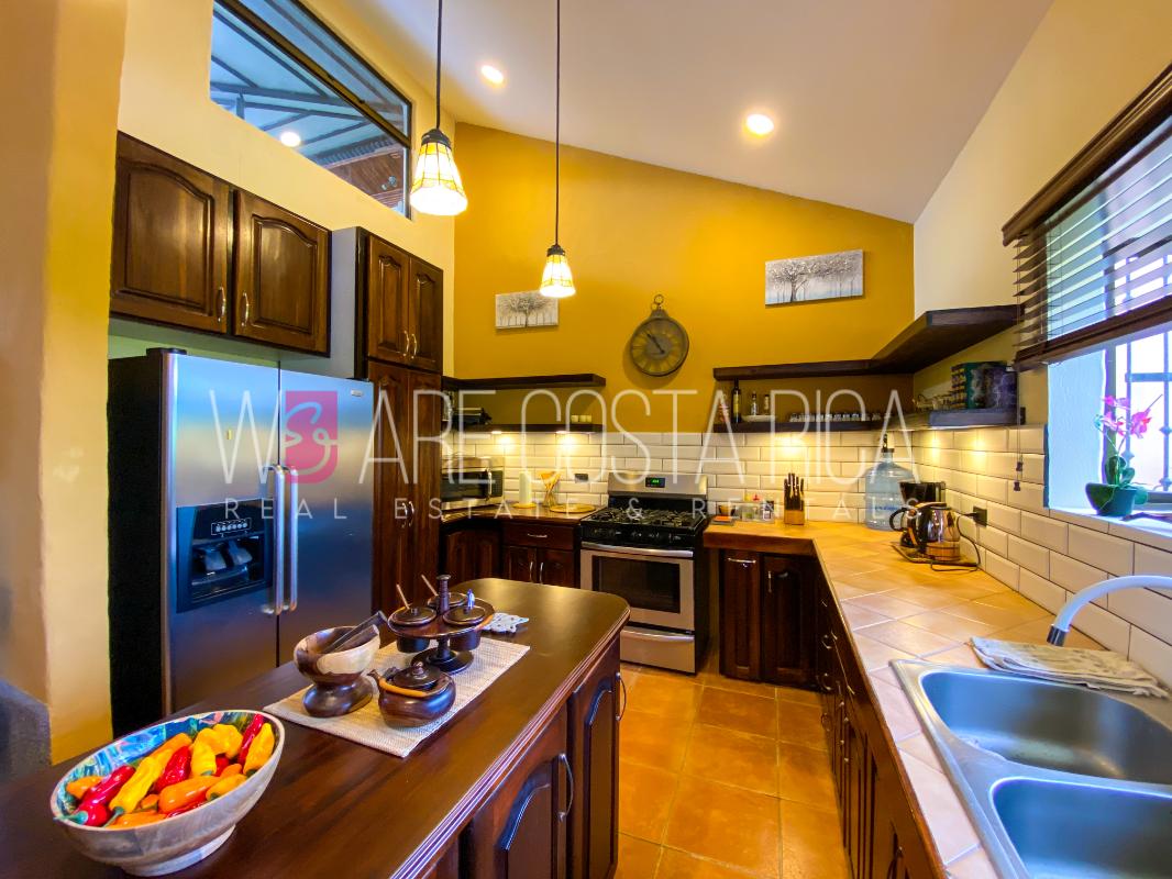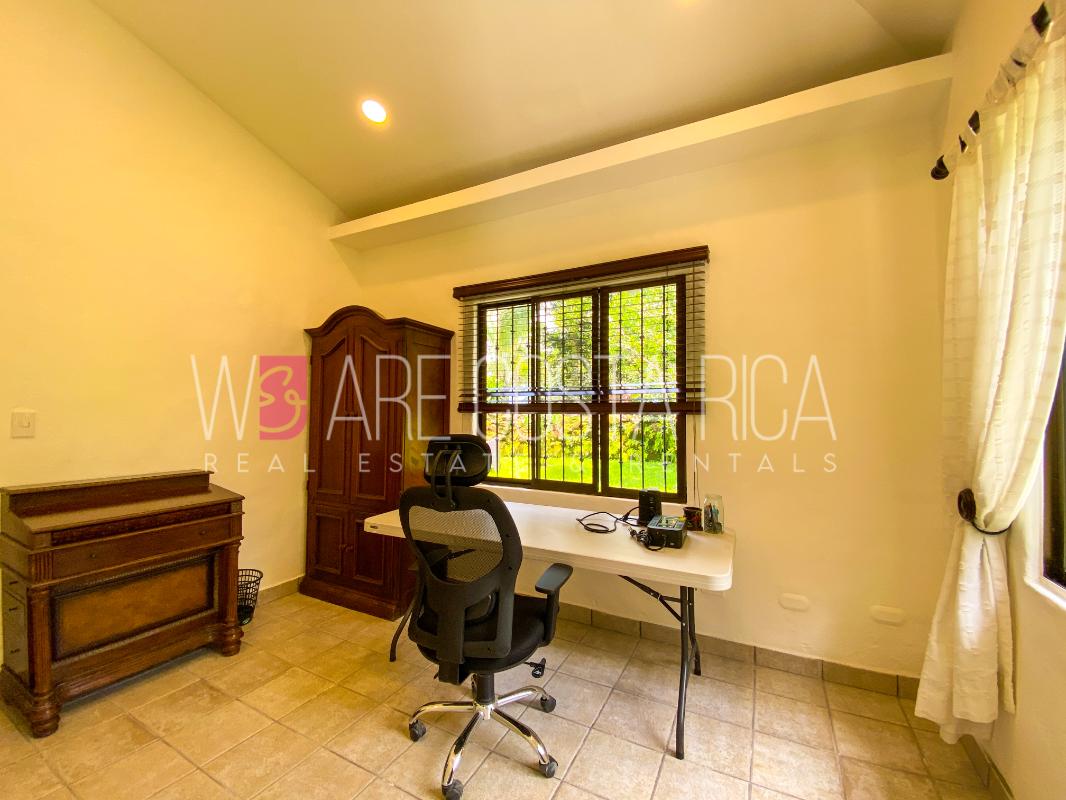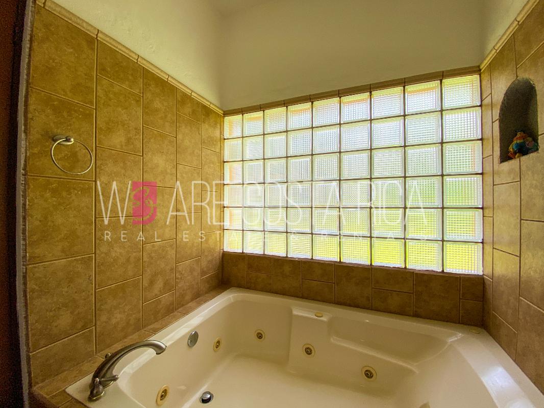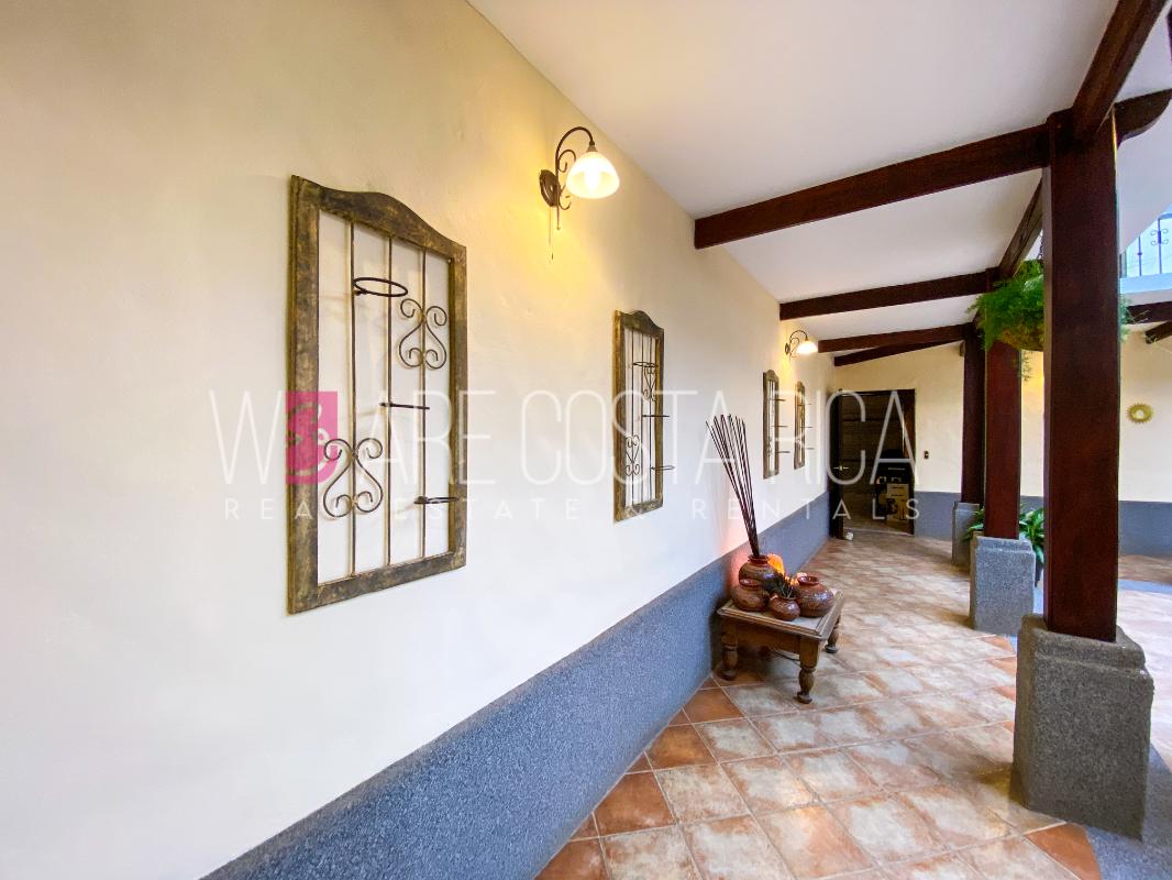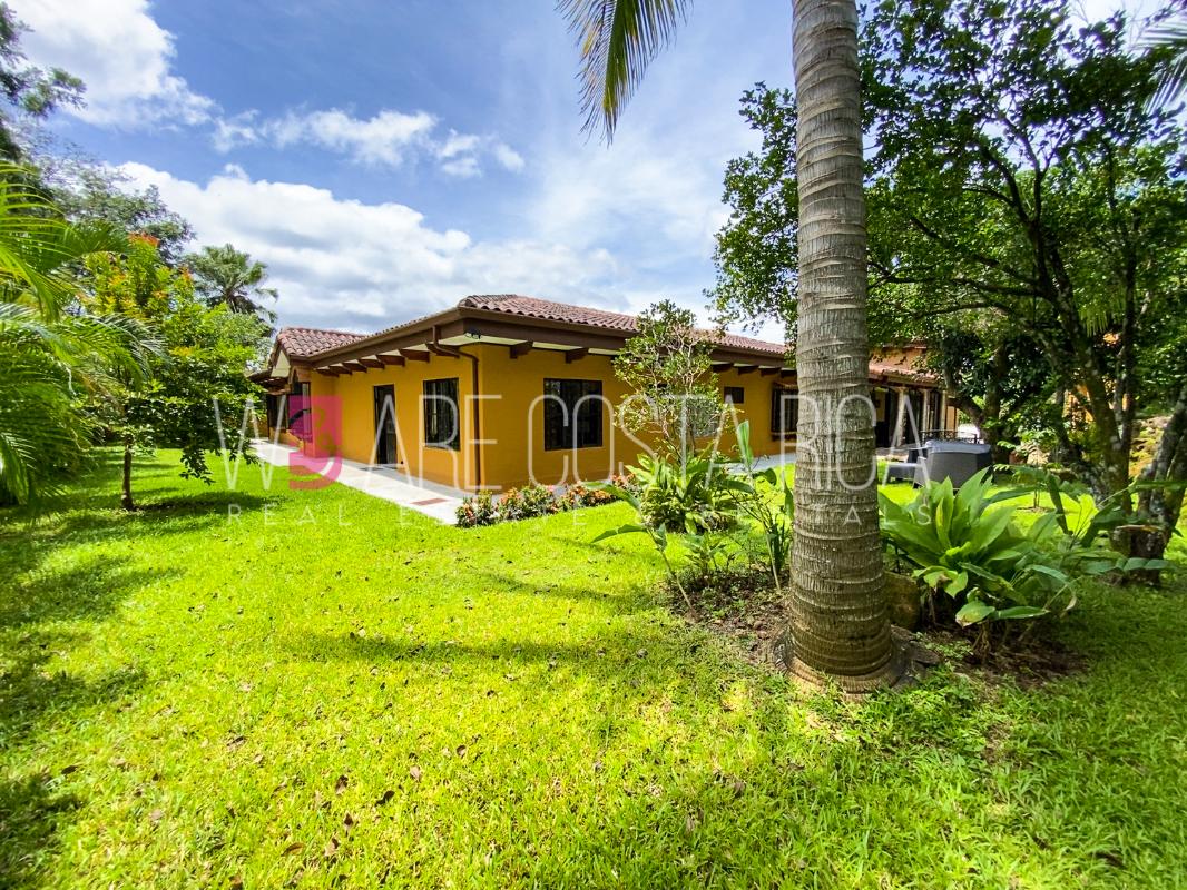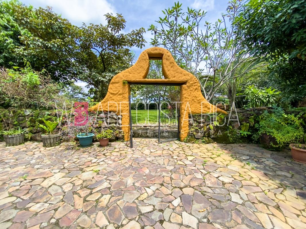 ID# 115914. Beautiful house for sale or rent in La Guácima, Hacienda Los Reyes, 623 sqmt construction, 1.153 sqmt land, 7 bedrooms, 3.5 baths, US$490.000 or US$3.000/mo (negotiable). Beautiful house that has a ranch-style architecture with ample spaces, fresh, wooden customized details, all in one level and it’s totally furnished! It has a large internal center terrace, fully covered by a huge vaulted skylight which provides maximum natural light to the entire house. The different spaces are distributed around this terrace, all of them with high ceilings. The kitchen, dinette and formal dining share one area; the living room and other terraces are in a separate area, as well as the bedrooms. There is an office that could be used as extra bedroom. The master bedroom has bath with jacuzzi. A beautiful landscaped garden surrounds the property. It also has full service room, bodega and closed garage for 2 vehicles. This property is located in Hacienda Los Reyes, an exclusive residential complex that offers 24/7 security and great amenities like its a golf course, club house, tennis courts, gym, and swimming pools. It is strategically located close to a variety of urban facilities, the international airport and private schools.
