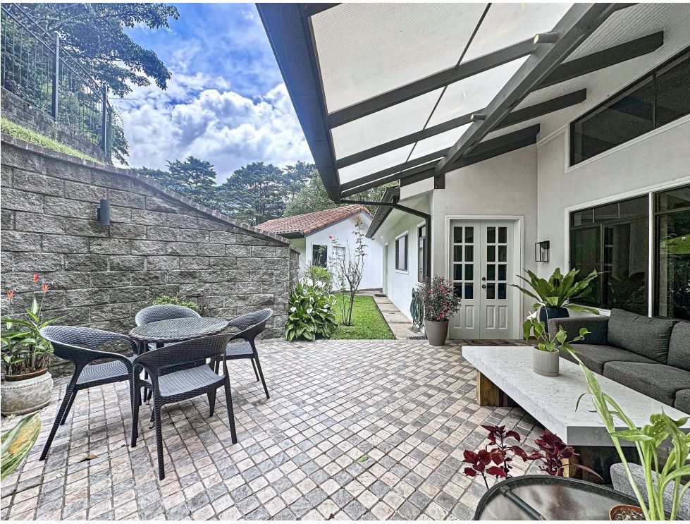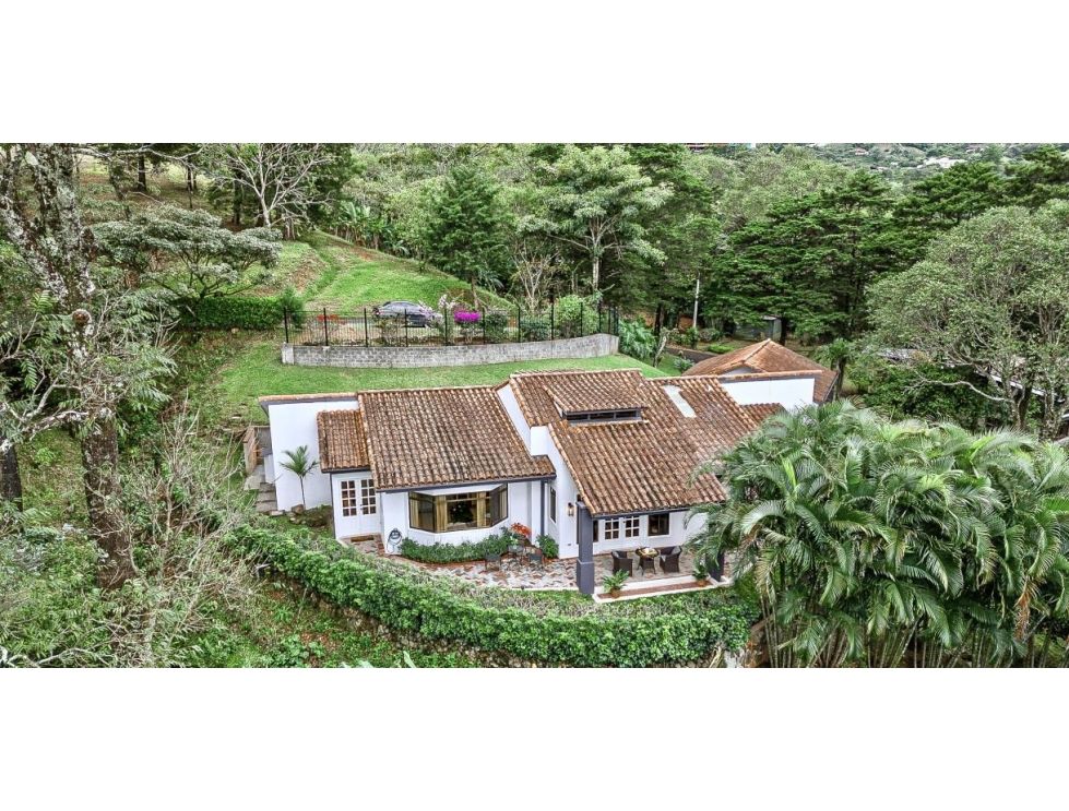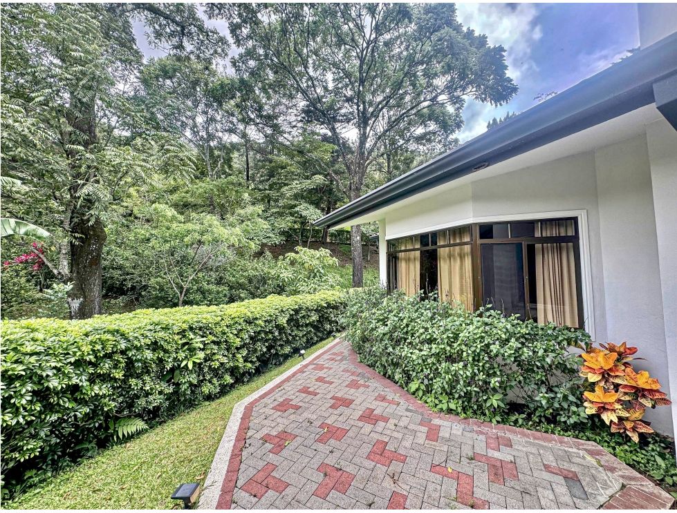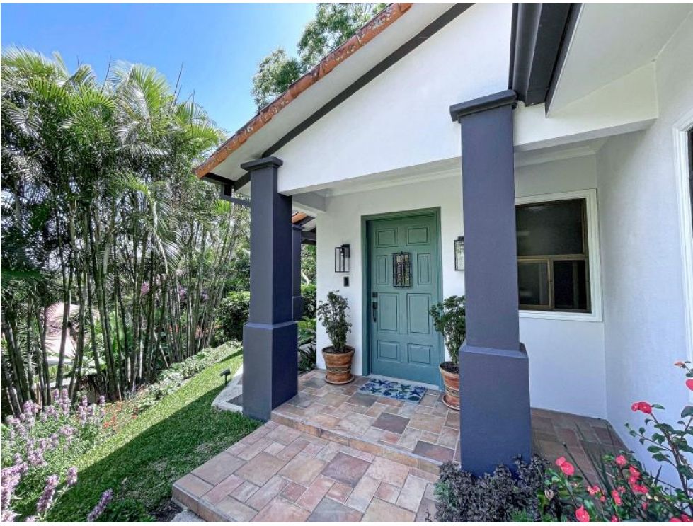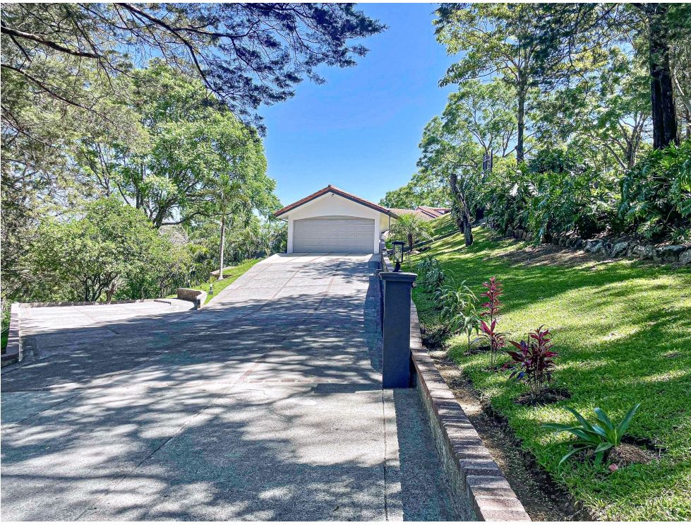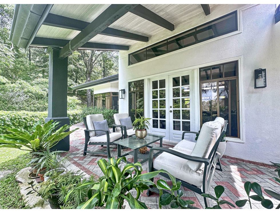 ID# 117471. One-Level Nature Estate for Sale in Santa Ana, Costa Rica. | 3 Bedrooms | 2 Bathrooms | 5,000 m² Land | 352 m² construction. Casa Evergreen Serenity is a one-level home for sale in Santa Ana, Costa Rica located inside a quiet gated residential zone surrounded by lush greenery and mountain views, offering a rare combination of privacy, nature, and immediate access to urban conveniences. This 3-bedroom, 2-bathroom residence sits on an extraordinary ~5,000 m² lot, making it stand out in the Santa Ana real estate market for buyers seeking space, tranquility, and expansion potential while remaining just minutes from shopping centers, private schools, hospitals, and direct access to Route 27. The property is pet friendly, ideal for families who value outdoor living, garden space, and a peaceful environment that feels like living in a private nature reserve. Inside, the home showcases warm architectural character with vaulted ceilings, exposed wood beams, wood-trim accent walls, and abundant natural light. Elegant French Colonial doors open onto expansive covered terraces at the front and rear, creating seamless indoor-outdoor living areas perfect for entertaining. The American style kitchen features refined cabinetry, generous storage, stainless steel appliances, and quartz countertops overlooking the landscaped garden. A dedicated laundry area, ceiling fans, designer lighting, and air conditioning (AC) add daily comfort and functionality to the home’s classic charm. The primary bedroom offers tranquil garden views, a lounge area, walk-in closet, and a spacious bathroom with double vanity, soaking tub, and walk-in shower. Two additional bedrooms also enjoy lush garden views and share a full bathroom. Outdoor living is where this property truly shines, with mature fruit trees including lemons, limes, oranges, bananas, grapefruit, and coffee, private walking trails, large green areas for pets and gatherings, and ample room to build a pool or even develop up to two additional homes on the higher grounds with valley and mountain views—an exceptional advantage for buyers looking for capital appreciation or income potential in Santa Ana. Additional features include 8 parking spaces, a detached 2-car garage, a 1,250-liter water reserve tank, and generous driveway access. The location places you minutes from Valle del Sol Golf Course, City Place, Terrazas Lindora, Auto Mercado, PriceSmart, Hospital Bíblica, Forum 1 & 2, and top private schools such as Saint Jude, Blue Valley, Country Day, American International, and Barkley, while also being 30 minutes from SJO International Airport and one hour 30 minutes from the Pacific Coast. Casa Evergreen Serenity is ideal as a primary residence, vacation home, or investment property for those seeking a nature estate with strategic connectivity in one of the most desirable areas of Santa Ana.