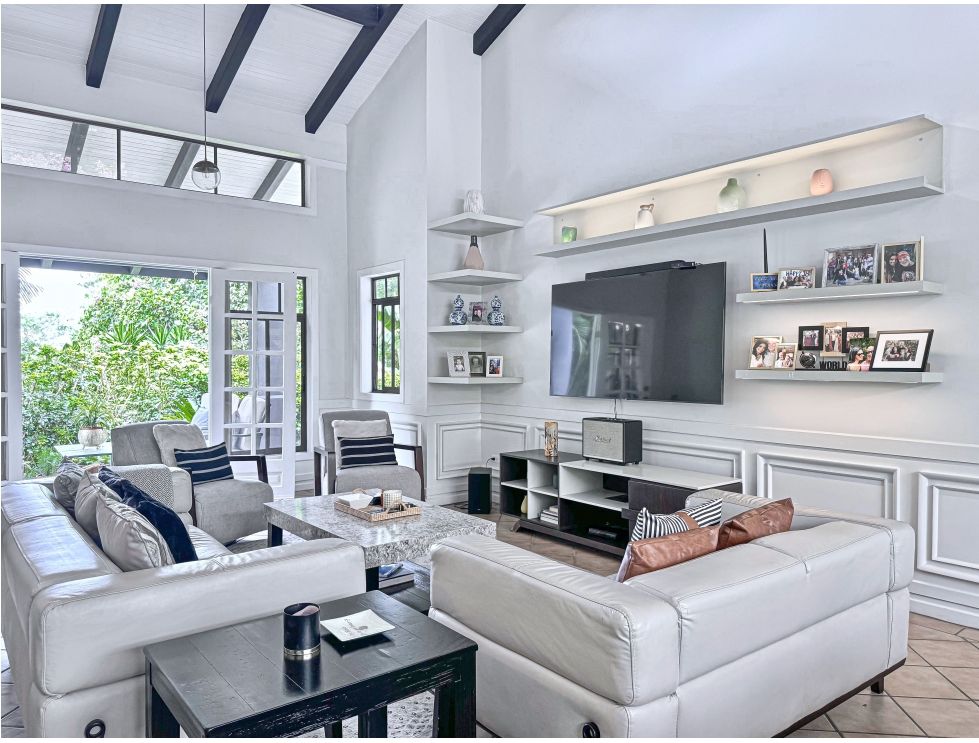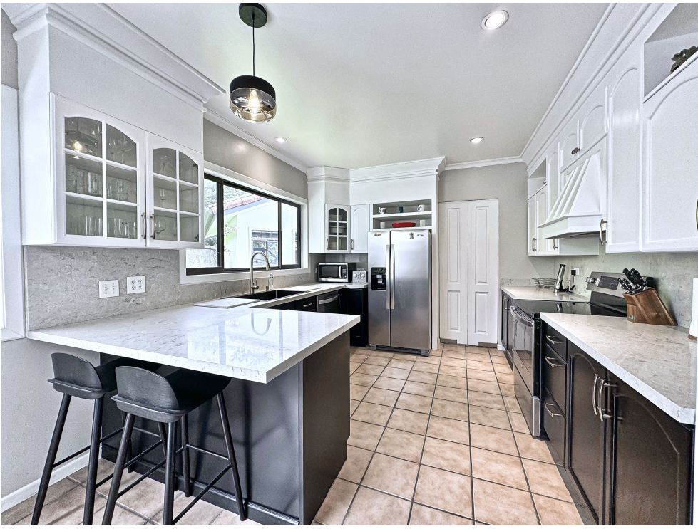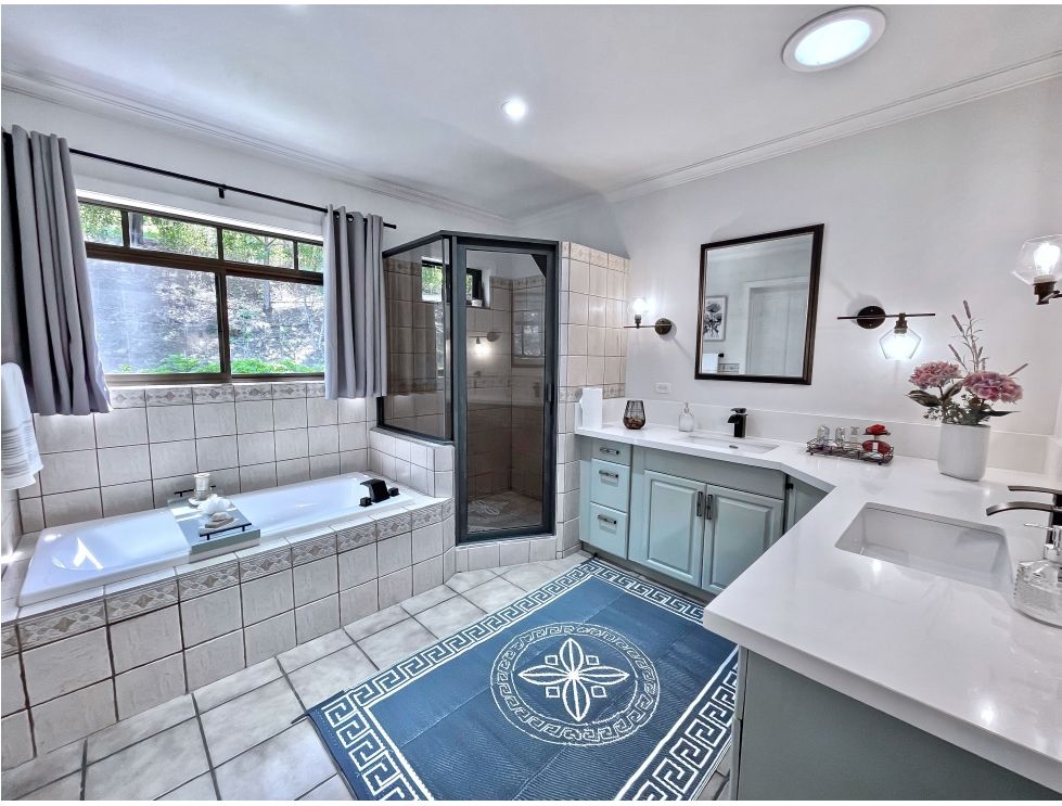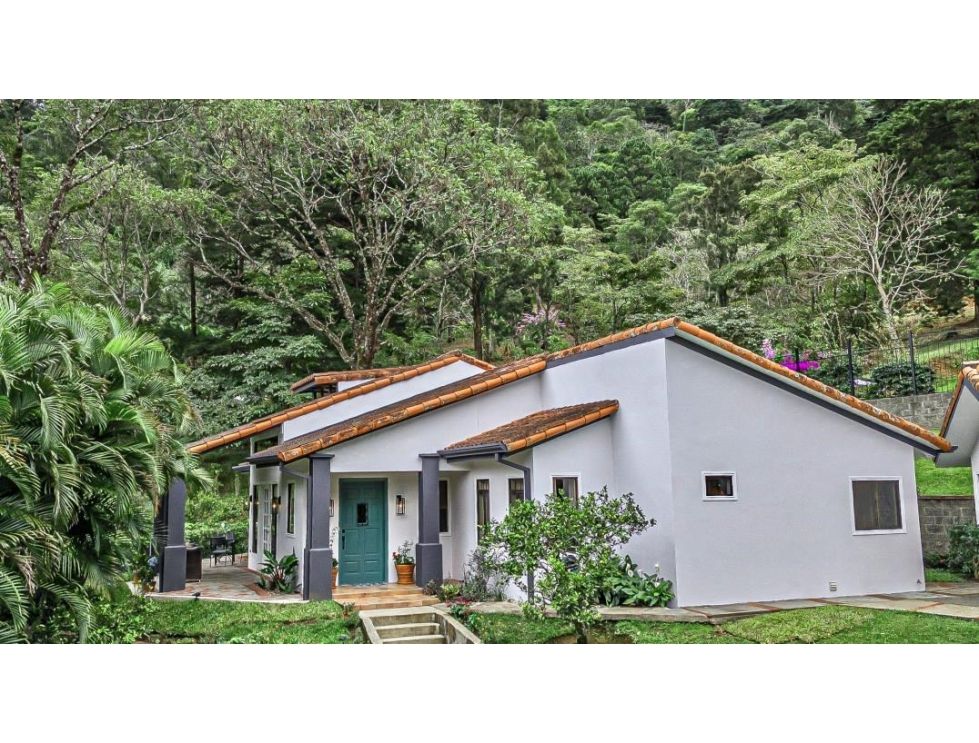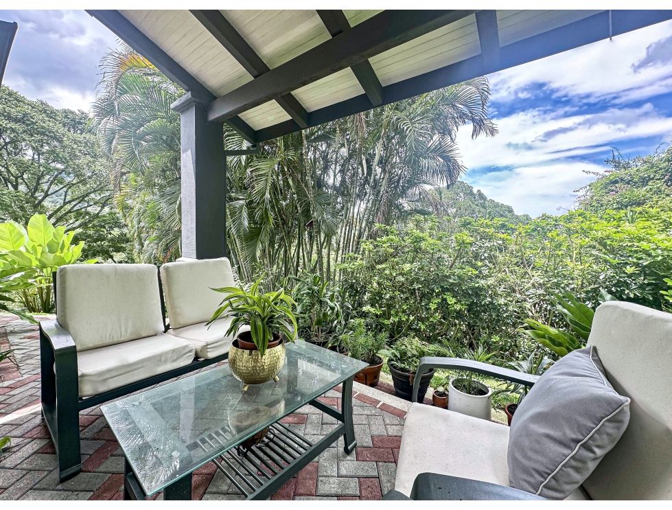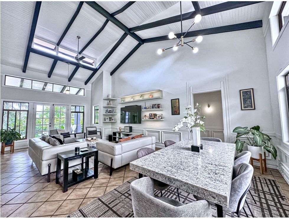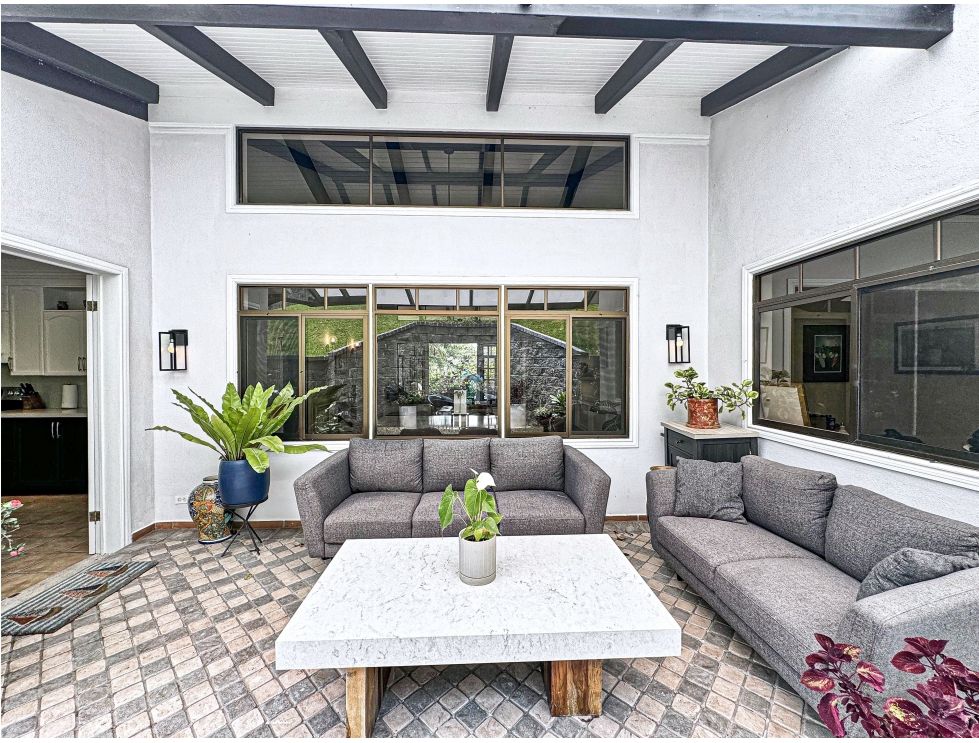 ID# 117471. One-Level Nature Estate for Sale in Santa Ana, Costa Rica. | 3 Bedrooms | 2 Bathrooms | 5,000 m² Land | 352 m² construction. Casa Evergreen Serenity is a one-level home for sale in Santa Ana, Costa Rica located inside a quiet gated residential zone surrounded by lush greenery and mountain views, offering a rare combination of privacy, nature, and immediate access to urban conveniences. This 3-bedroom, 2-bathroom residence sits on an extraordinary ~5,000 m² lot, making it stand out in the Santa Ana real estate market for buyers seeking space, tranquility, and expansion potential while remaining just minutes from shopping centers, private schools, hospitals, and direct access to Route 27. The property is pet friendly, ideal for families who value outdoor living, garden space, and a peaceful environment that feels like living in a private nature reserve. Inside, the home showcases warm architectural character with vaulted ceilings, exposed wood beams, wood-trim accent walls, and abundant natural light. Elegant French Colonial doors open onto expansive covered terraces at the front and rear, creating seamless indoor-outdoor living areas perfect for entertaining. The American style kitchen features refined cabinetry, generous storage, stainless steel appliances, and quartz countertops overlooking the landscaped garden. A dedicated laundry area, ceiling fans, designer lighting, and air conditioning (AC) add daily comfort and functionality to the home’s classic charm. The primary bedroom offers tranquil garden views, a lounge area, walk-in closet, and a spacious bathroom with double vanity, soaking tub, and walk-in shower. Two additional bedrooms also enjoy lush garden views and share a full bathroom. Outdoor living is where this property truly shines, with mature fruit trees including lemons, limes, oranges, bananas, grapefruit, and coffee, private walking trails, large green areas for pets and gatherings, and ample room to build a pool or even develop up to two additional homes on the higher grounds with valley and mountain views—an exceptional advantage for buyers looking for capital appreciation or income potential in Santa Ana. Additional features include 8 parking spaces, a detached 2-car garage, a 1,250-liter water reserve tank, and generous driveway access. The location places you minutes from Valle del Sol Golf Course, City Place, Terrazas Lindora, Auto Mercado, PriceSmart, Hospital Bíblica, Forum 1 & 2, and top private schools such as Saint Jude, Blue Valley, Country Day, American International, and Barkley, while also being 30 minutes from SJO International Airport and one hour 30 minutes from the Pacific Coast. Casa Evergreen Serenity is ideal as a primary residence, vacation home, or investment property for those seeking a nature estate with strategic connectivity in one of the most desirable areas of Santa Ana.